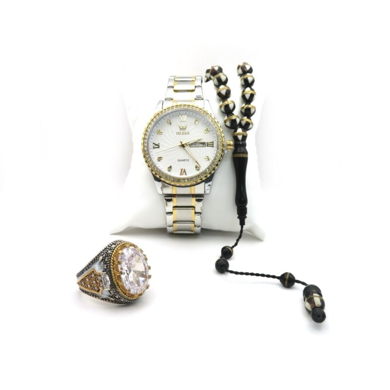 قبل نصف ساعة مجموعة رجالية: خاتم من الفضة الاسترلينية عيار 925، وساعة Elements الفاخرة، ومسبحة Fatura المكونة من 33 حبة. - مجموعة رجال سماويين – أبيض